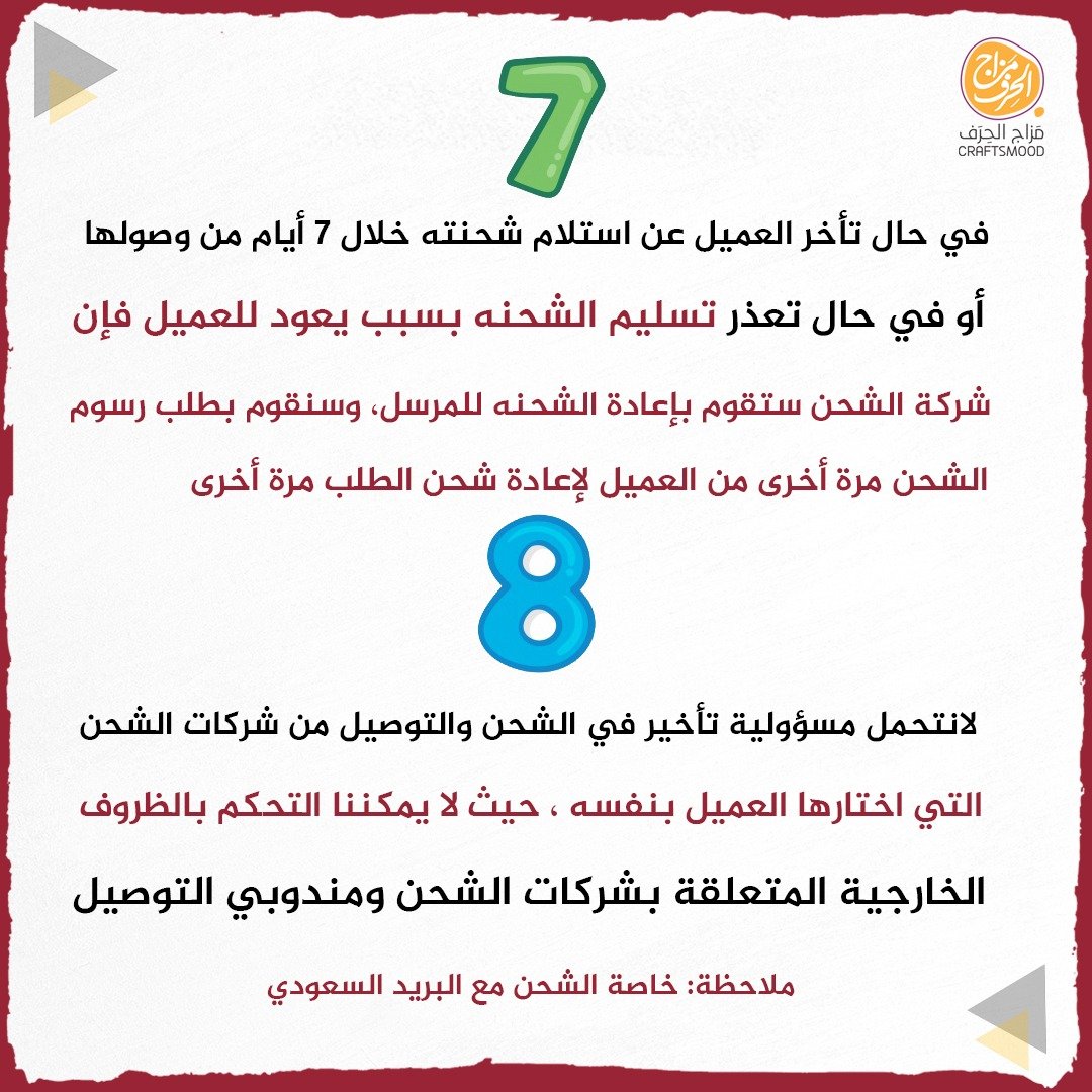4- في حال وصول الكرتونة إلى العميل تالفه، فإننا نطلب من عملائنا الكرام التقاط صورة للكرتونة التالفه و إرسالها على رقم الواتس اب الخاص بمتجر مزاج الحرف الالكتروني وسوف نوفر لك بديلًا بدون تكلفه وذالك خلال مدة لا تتجاوز 3 - 10 ايام من تاريخ استلام العميل للطلب .