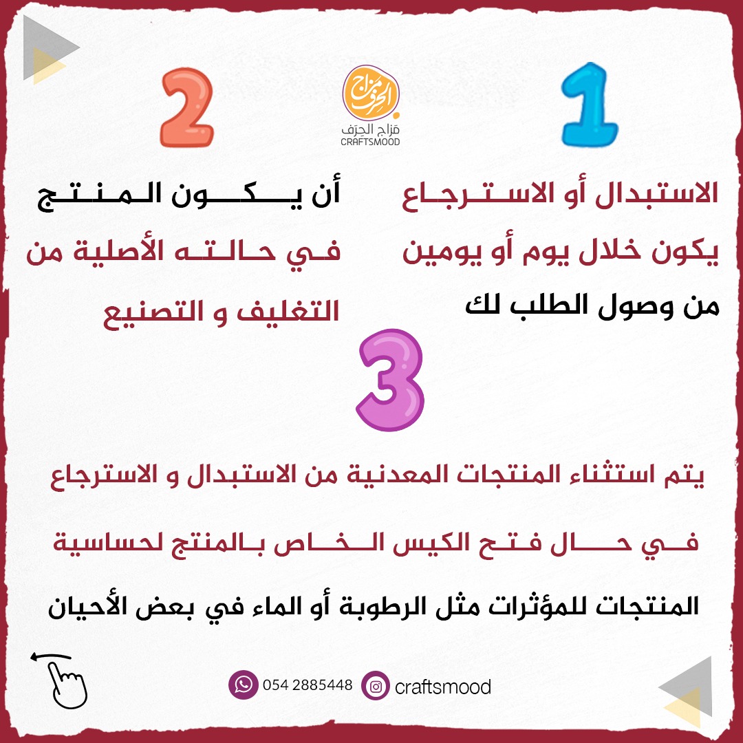 5- لا يمكنك استبدال او إرجاع المنتجات التي تكون حسب الطلب وذلك لعدم تمكن متجر مزاج الحرف الالكتروني من إعادة بيعها او عرضها ، الا اذا كانت المنتجات لا تشمل المتفق عليه بين العميل و متجر مزاج الحرف الالكتروني..