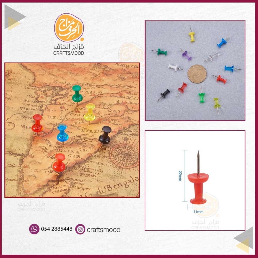 علبة دبابيس ملونة تحتوي المجموعة على 600 دبوس حاد الطرف، مقسمة الى 12 قسم حسب الوانها المتعددة ، كل لون يحتوي على 50 حبة